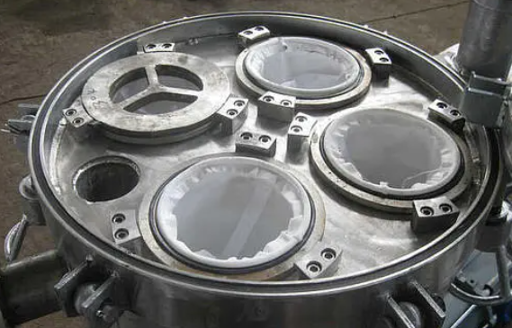 多袋式過濾器是一種壓力式過濾裝置,主要的結構組成部件為過濾筒體、過濾筒蓋和快開機構、不銹鋼濾袋加強網,工作時濾漿用泵打入壓力容器內,通過濾袋進行過濾。過濾時因為濾袋直徑比籠架大,壓濾時濾袋緊貼籠架。截獲的固相顆粒牯附在濾袋表面上形成濾餅,通過濾袋過濾后的濾液排出殼體。