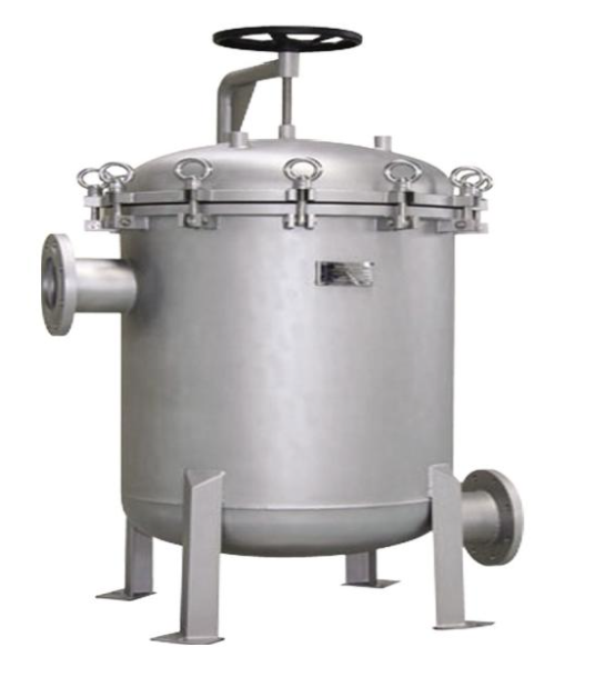 袋式顧慮器的設計原理是液體從過濾容器側面或者下面進水口進入,由支撐網框的濾袋上方沖入濾袋中,濾袋因液體的沖擊和均勻的壓力面展開,使得液體物料在整個過濾袋內表面得到均勻分布,透過濾袋的液體沿著金屬支承網籃壁,由過濾器底部出水口排出。水質中的顆粒雜質等被截留在濾袋內。過濾器在運行一段時間后,當進出口壓差達到0.05-0.07MPa時,打開過濾器端蓋,把截留物和濾袋一起取出,清洗濾袋,即可接著使用。