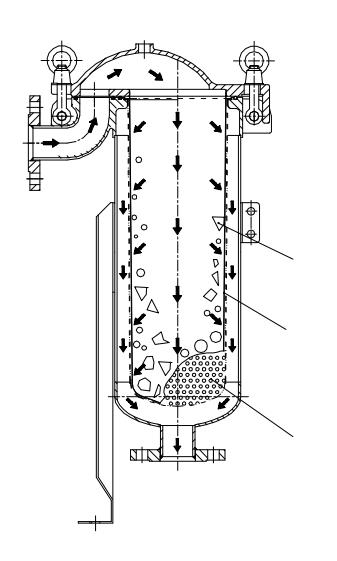側(cè)入式多袋式過(guò)濾器液體從側(cè)方進(jìn)入不銹鋼罐體,受到設(shè)備本身壓力的沖擊,液體向?yàn)V袋四周均勻的展開,干凈的液體透過(guò)濾袋,由底部出水口流出,濾渣則被攔截在濾袋內(nèi)部。